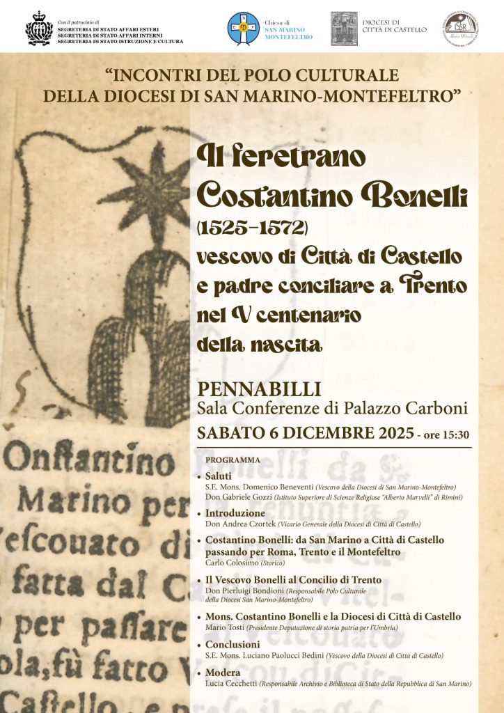 Il Polo Culturale della Diocesi di San Marino-Montefeltro organizza, nella ricorrenza del V centenario della nascita, una giornata di studio sulla figura del sammarinese S.E. Bonelli mons. Costantino (1525-1572), figlio illustre della Repubblica di San Marino e di questa Diocesi eletto, nel 1560, Vescovo di Città di Castello.