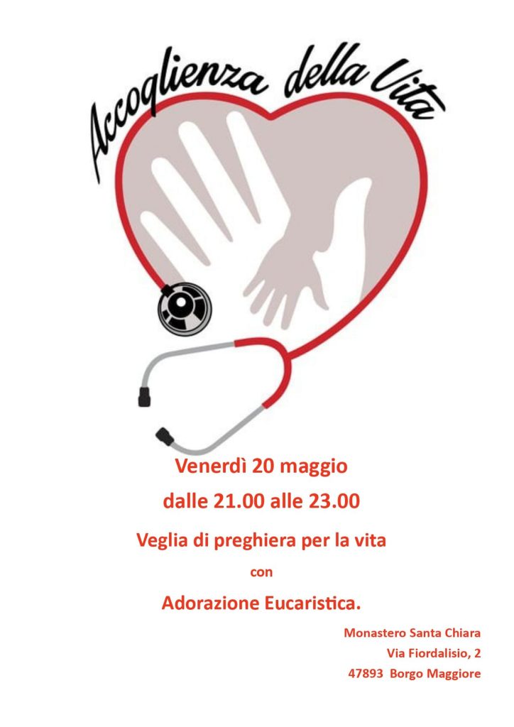 Quest'anno la Marcia per la Vita in Italia è stata sostituita da un momento di Adorazione per la vita. In Diocesi si terrà una Veglia di preghiera per la vita con Adorazione Eucaristica venerdì 20 maggio dalle ore 21 alle ore 23 a San Marino, presso la Cappella delle monache clarisse di Valdragone