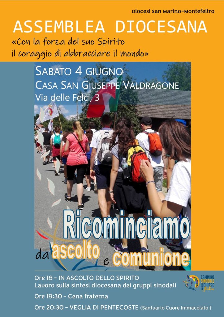 Sabato 4 giugno dalle ore 16 presso Casa San Giuseppe (via delle Felci 3 Valdragone RSM) si terrà l'Assemblea diocesana di fine anno. TUTTI INVITATI. Alle 20:30 l'Assemblea si concluderà con la Veglia di Pentecoste nel Santuario del Cuore Immacolato di Maria in Valdragone (RSM)