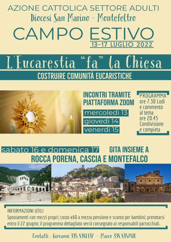 Dal 13 al 17 luglio l'Azione Cattolica Settore adulti organizza un campo scuola sul tema: "L'Eucarestia fa la Comunità". I primi tre giorni si svolgeranno su piattaforma Zoom (preghiera del mattino, meditazione e condivisione serale). Sabato 16 e domenica 17 luglio gita insieme a Rocca Porena, Cascia e Montefalco. Iscrizioni entro il 22 giugno