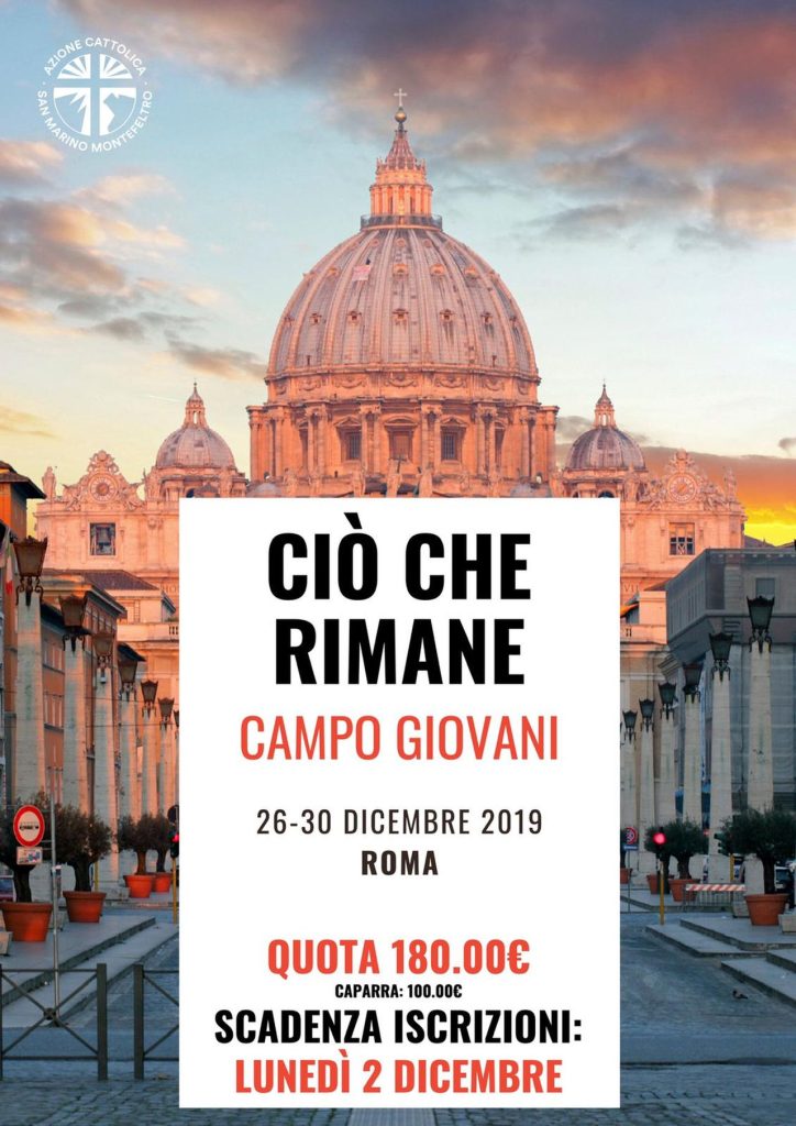 L'Azione Cattolica organizza un campo per i giovani dal 26 al 30 dicembre a Roma. Il campo è intitolato: "Ciò che rimane". Le iscrizioni sono aperte fino al 2 dicembre