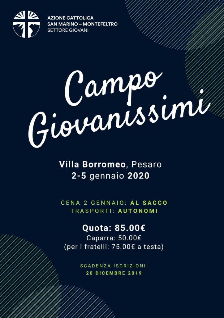 -L'Azione Cattolica Settore Giovani organizza un campo per giovanissimi dal 2 al 5 gennaio 2020 presso la "Villa Borromeo" di Pesaro. Le iscrizioni sono aperte fino al 20 dicembre 2020