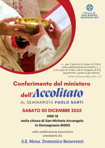 Abbiamo chiesto al seminarista Paolo Santi come vive e come si sta preparando a ricevere l’Accolitato per istituzione da parte del Vescovo Domenico, sabato 20 dicembre alle ore 18 nella sua parrocchia di origine, Domagnano (RSM). Il 20 dicembre, nella chiesa di San Michele Arcangelo in Domagnano (RSM), mi sarà…