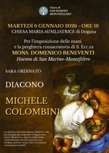 Martedì 6 gennaio, solennità dell’Epifania, alle ore 16, nella chiesa parrocchiale di Dogana (RSM), il Vescovo, monsignor Domenico Beneventi, presiederà l’ordinazione diaconale di Michele Colombini. Papa Francesco si è rivolto in passato ai diaconi permanenti con queste parole che chiarificano quale sia il posto del diacono nella chiesa: «Voi avete un…