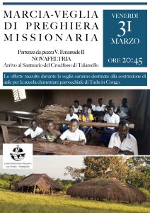 Venerdì 31 marzo ore 20:45 il Centro Missionario Diocesano organizza la marcia-veglia missionaria da Novafeltria (piazza Vittorio Emanuele II) al Santuario del SS.Crocifisso di Talamello. Gli aiuti quest'anno saranno indirizzati alla scuola elementare parrocchiale di Tadu in Congo…