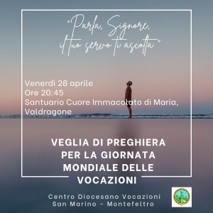 Venerdì 28 aprile alle ore 20:45 presso il Santuario del Cuore Immacolato di Valdragone (RSM) si terrà la Veglia diocesana di preghiera per la Giornata Mondiale delle Vocazioni intitolata: "Parla, Signore, il tuo servo ti ascolta"…