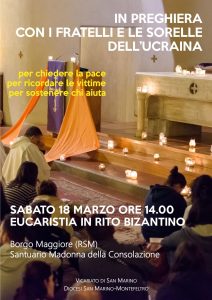 Sabato 18 marzo alle ore 14 presso il Santuario Madonna della Consolazione a Borgo Maggiore (RSM) si terrà una Solenne Eucaristia in rito bizantino con la comunità Ucraina residente a San Marino. Presiede la liturgia il Vescovo Andrea con la presenza del parroco cattolico degli Ucraini a San Marino…