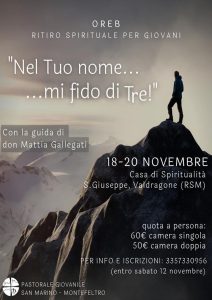 Dal 18 al 20 novembre si tiene presso "Casa San Giuseppe" a Valdragone (RSM) un ritiro spirituale per giovani sul tema: "Nel Tuo nome... mi fido di Tre!", con la guida di don Mattia Gallegati, direttore del Centro regionale Vocazioni…