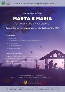 Domenica 20 novembre l'Ufficio Famiglia Diocesano organizza un ritiro per tutte le famiglie in preparazione al Natale a Montefiorentino (PU) dalle ore 10 sul tema "Marta e Maria. Una casa che sa accogliere". Guida padre Marco ofm…