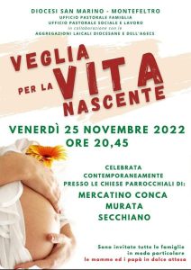 Venerdì 25 novembre alle ore 20:45 in contemporanea presso le chiese parrocchiali di Mercatino Conca, Secchiano e Murata si celebrerà la Veglia di preghiera per la Vita nascente all'interno degli "80 giorni per la Vita" che culmineranno nel mese di febbraio con la Giornata per la Vita (5 febbraio 2023)…