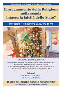 L’Ufficio Scuola della Diocesi propone un momento di approfondimento circa il decreto attuativo del 3 ottobre 2022 sulle «Indicazioni curricolari dell’Insegnamento della Religione Cattolica» nelle scuole di ogni ordine e grado nella Repubblica di San Marino. In particolare, si parlerà dell’introduzione dell’IRC nella Scuola d’Infanzia: "L'insegnamento della religione cattolica nella…