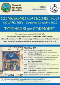 L'Ufficio Catechistico Diocesano organizza per domenica 23 ottobre a Novafeltria, dalle ore 9 alle ore 18 un Convegno per tutti i catechisti e gli operatori pastorali dal titolo: "Formarsi per formare". I relatori saranno: don Alessandro Zavattini, professore di Teologia pastorale e catechesi all'ISSR "A. Marvelli", mons. Valentino Bulgarelli, direttore…