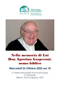 Mercoledì 26 ottobre alle ore 18 a Rimini nella chiesa di Santa Maria Annunziata della Scolca (San Fortunato) si terrà una celebrazione eucaristica in ricordo di don Agostino Gasperoni presieduta da S.E. Mons. Andrea Turazzi. Seguirà un momento assembleare e conviviale presso i locali del Seminario vescovile di Rimini…