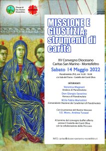 Sabato 14 maggio dalle ore 15:30 alle ore 18:30 presso il Castello di Piandimeleto (PU) si terrà il XV Convegno diocesano Caritas. Sarà un momento di incontro e di confronto sul tema "MISSIONE E GIUSTIZIA: STRUMENTI DI CARITA' "…