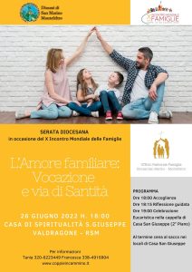 Domenica 26 giugno dalle ore 18 a Valdragone (RSM) presso Casa San Giuseppe si svolgerà una serata diocesana in occasione del X Incontro Mondiale delle Famiglie a Roma: "L'Amore familiare: Vocazione e via di Santità". Alle ore 19 Celebrazione eucaristica nella Cappella di Casa San Giuseppe…