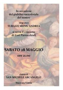 Sabato 28 maggio alle ore 21 presso la chiesa di San Michele a Macerata Feltria si terrà un concerto di cori parrocchiali in occasione del 50° anniversario di ordinazione sacerdotale del Vescovo Andrea…