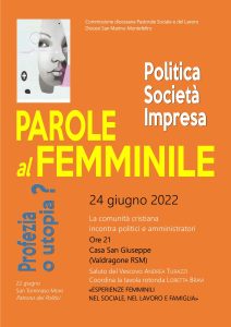 La Commissione diocesana di Pastorale Sociale e del Lavoro organizza per venerdì 24 giugno, nel contesto della festa di San Tommaso Moro (patrono dei politici), alle ore 21 presso Casa San Giuseppe (Valdragone RSM), una tavola rotonda sul tema: "Politica. Società. Impresa. Parole al femminile. Profezia o utopia?".