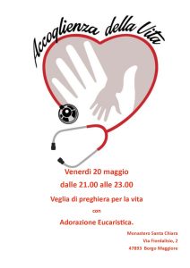Quest'anno la Marcia per la Vita in Italia è stata sostituita da un momento di Adorazione per la vita. In Diocesi si terrà una Veglia di preghiera per la vita con Adorazione Eucaristica venerdì 20 maggio dalle ore 21 alle ore 23 a San Marino, presso la Cappella delle monache…