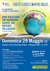 Domenica 29 maggio dalle ore 16:30 al Santuario Cuore Immacolato di Maria a Valdragone si terrà il 23° Incontro e cena di solidarietà organizzato da Carità senza Confini sul tema “PER EDUCARE UN BAMBINO SERVE UN INTERO VILLAGGIO” (Proverbio africano) - Sfida per un’educazione globale. Il relatore sarà il Prof.
