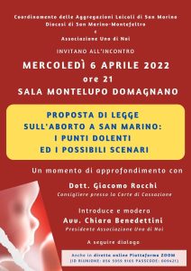 Mercoledì 6 aprile alle ore 21 presso la Sala Montelupo di Domagnano il Coordinamento delle Aggregazioni Laicali di San Marino e l'Associazione Uno di noi organizzano un incontro pubblico sul tema: "Proposta di legge sull'aborto a San Marino: i punti dolenti ed i possibili scenari"…