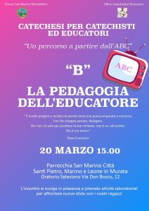 Domenica 20 marzo dalle ore 15 presso la parrocchia di San Marino Città (Oratorio Salesiano via Don Bosco 12 RSM) si terrà in presenza la III Catechesi per catechisti ed educatori organizzata dall'Ufficio Catechistico Diocesano: "La pedagogia dell'educatore"…
