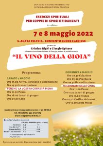 Sabato 7 e domenica 8 maggio presso il Convento delle Clarisse di Sant'Agata Feltria l'Ufficio Famiglia Diocesano organizza una "due giorni" di Esercizi Spirituali per le coppie di sposi e di fidanzati. Il Corso sarà guidato da Cristina Righi e Giorgio Epicoco (Associazione AmarLui - sez. di Perugia)…