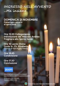 Domenica 21 novembre il Vescovo Andrea insieme agli Uffici Pastorali e alle Aggregazioni invita a trascorrere un pomeriggio di spiritualità unitario (ore 15:30-17:30) come ingresso nel Tempo forte dell’Avvento. Dopo la preghiera allo Spirito e l'introduzione del Vescovo, terrà la Lectio Divina suor Chiara Elisabetta, clarissa, maestra spirituale e biblista.