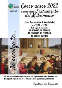 A partire dal 16 gennaio 2022 presso la sala parrocchiale di Novafeltria si svolgerà il nuovo corso in preparazione al sacramento del Matrimonio per tutte le parrocchie della Valmarecchia. Per info e prenotazioni: sposinchiesa@gmail.com…