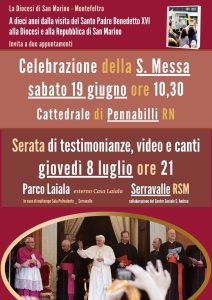 A 10 anni dalla visita del Santo Padre Benedetto XVI alla Diocesi e alla Repubblica di San Marino la Diocesi invita a due appuntamenti: sabato 19 giugno ore 10:30 celebrazione eucaristica in Cattedrale a Pennabilli; giovedì 8 luglio ore 21 serata di testimonianze, video e canti a Serravalle (parco Laiala)…
