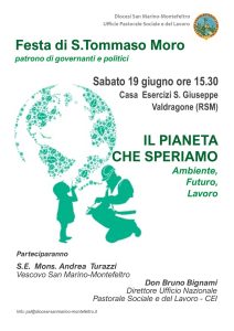 Sabato 19 giugno dalle ore 15:30 presso Casa San Giuseppe a Valdragone (RSM), in occasione della Giornata dei politici che si svolge nei giorni della festa di San Tommaso Moro, patrono dei politici, si terrà un incontro organizzato dalla Commissione diocesana di Pastorale sociale dal titolo: "Il pianeta che speriamo:…