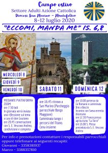 Dall'8 al 12 luglio si terrà il Campo estivo per gli adulti organizzato dall'AC diocesana intitolato: "Eccomi, manda me". I primi tre giorni gli incontri si terranno sulla piattaforma Zoom, il sabato e la domenica in presenza. Tutti invitati!…