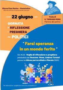 Lunedì 22 giugno, FESTA DI SAN TOMMASO MORO, patrono dei politici, DALLE ORE 18:30 ALLE ORE 20, nella chiesa dei Santi Pietro, Marino e Leone di Murata (RSM), si terrà la GIORNATA DI RIFLESSIONE E DI PREGHIERA CON E PER I POLITICI…