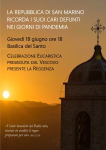 Per iniziativa degli Ecc.mi Capitani Reggenti GIOVEDI' 18 GIUGNO alle ORE 18.00, il Vescovo Andrea celebrerà nella Basilica del Santo una SANTA MESSA IN SUFFRAGIO DELLE PERSONE DEFUNTE DURANTE LA FASE DI EMERGENZA SANITARIA A CAUSA DELLA PANDEMIA…