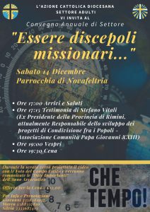 L'Azione Cattolica Diocesana Settore adulti invita tutti al Convegno annuale che si terrà sabato 14 dicembre a Novafeltria a partire dalle ore 17. Il tema sarà: "Essere discepoli missionari", con la testimonianza di Stefano Vitali dell'Associazione Papa Giovanni XXIII…