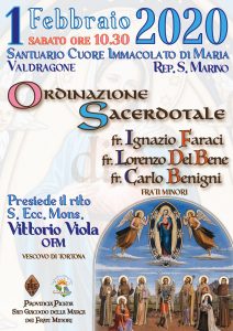 Sabato 1 febbraio alle ore 10.30 nel Santuario del Cuore Immacolato di Maria in Valdragone si terrà l'ordinazione sacerdotale di fra Ignazio Faraci ofm. Presiede il rito S.E. Mons. Vittorio Viola ofm, vescovo di Tortona…