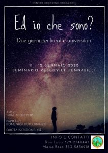 Sabato 11 e domenica 12 gennaio si terrà a Pennabilli, presso il Seminario Vescovile, una "due giorni" per studenti delle scuole superiori e universitari organizzata dal Centro Diocesano Vocazioni. La "due giorni" è intitolata: "Ed io che sono?"…
