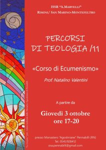 Da MERCOLEDì 2 OTTOBRE partirà a Pennabilli presso il Monastero delle Agostiniane un corso di Ecumenismo tenuto dal prof. Natalino Valentini, direttore dell'Istituto Superiore di Scienze Religiose delle diocesi di Rimini e San Marino-Montefeltro. Il corso consiste di sei incontri, tutti di giovedì, dalle ore 17 alle ore 20…