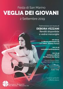 Lunedì 2 settembre a partire dalle ore 20:15 si terrà la Veglia dei giovani per la festa di San Marino presso la Basilica del Santo. Dopo la S.Messa presieduta dal Vescovo Andrea, Debora Vezzani terrà un concerto-testimonianza sul tema: "Renditi disponibile e vedrai meraviglie"…