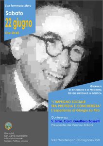 Sabato 22 giugno, festa di San Tommaso Moro, si terrà il momento diocesano delle Giornate di riflessione e di preghiera per gli impegnati in politica. Alle ore 20:45 presso la Sala "Montelupo" di Domagnano (RSM) S. Emin. Card. Gualtiero Bassetti, presidente dei Vescovi Italiani, aprirà la riflessione sul tema: "L’impegno…