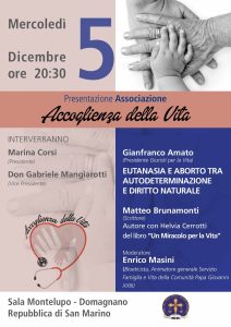 Mercoledì 5 dicembre ore 20:30 si terrà la presentazione dell'Associazione "Accoglienza della vita" presso la Sala Montelupo di Domagnano (RSM). Interverranno Marina Corsi (Presidente) e don Gabriele Mangiarotti (Vice Presidente).