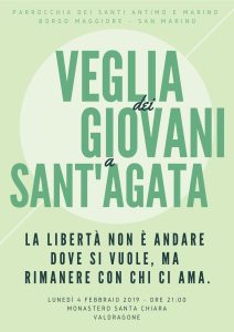 Lunedì 4 febbraio ore 21 presso il Monastero delle Clarisse a Valdragone si terrà la VEGLIA DEI GIOVANI per la festa di SANT'AGATA…