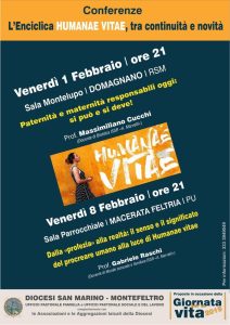 Venerdì 1 febbraio a Domagnano (Sala Montelupo) ore 21 conferenza per la Giornata della vita: "Paternità e maternità responsabili oggi: si può e si deve!". Relatore prof. Massimiliano Cucchi. Venerdì 8 febbraio a Macerata Feltria (sala parrocchiale) ore 21 conferenza dal titolo: "Dalla profezia alla realtà: il senso e il…