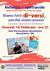 Venerdì 15 febbraio ore 21 presso la Sala parrocchiale di Novafeltria si terrà un incontro-spettacolo dal titolo: "Siamo fatti di-versi perchè siamo poesia": musica, parole, immagini, poesia con Guido Marangoni. Ingresso libero…