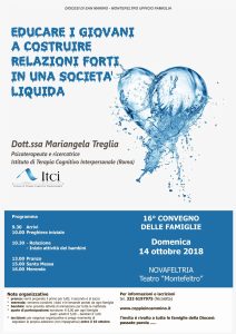 Domenica 14 ottobre a Novafeltria, presso il Teatro "Montefeltro" si terrà il 16° Convegno delle famiglie sul tema: "Educare i giovani a costruire relazioni forti in una società liquida. Relatore: dott.ssa Mariangela Treglia…