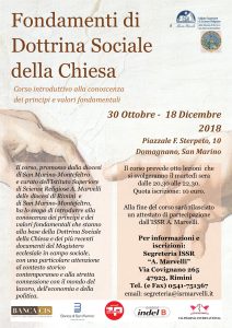 Da martedì 30 ottobre per 8 martedì consecutivi dalle ore 20.30 alle 22.30 si terrà un corso di Fondamenti di Dottrina Sociale della Chiesa presso la Sala vescovile di Domagnano (RSM, p.zza F. da Sterpeto, 10)…