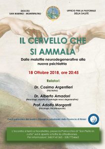 Giovedì 18 ottobre ore 20:45 l'Ufficio di Pastorale della Salute organizza a Novafeltria, presso la Sala parrocchiale, nel contesto della Giornata per i medici, una conferenza dal titolo: "Il cervello che si ammala. Dalle malattie neurodegenerative alla nuova psichiatria". Relatori: dott. Cosimo Argentieri, dott. Alberto Amadori e prof. Adolfo Morganti…