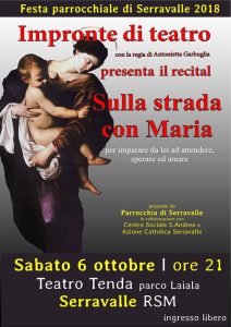 Sabato 6 ottobre alle ore 21 presso il Teatro Tenda (Parco Laiala) la parrocchia di Serravalle in collaborazione con il Centro Sant'Andrea e l'Azione Cattolica di Serravalle, durante la festa dedicata alla Madonna del Rosario, propongono il Recital dal titolo: «Sulla strada con Maria», regia di Antonietta Garbuglia…