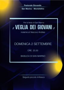 Domenica 2 settembre, vigilia della festa di San Marino, patrono della diocesi di San Marino-Montefeltro, si terrà la consueta VEGLIA DEI GIOVANI presso la Basilica del Santo alle ore 20:30. Presiede il Vescovo Andrea…
