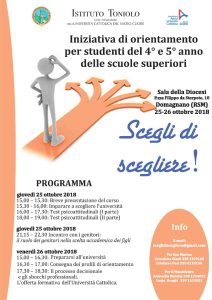 Giovedì 25 e venerdì 26 ottobre presso la Sala della Diocesi a Domagnano si terrà il Corso di Orientamento universitario "Scegli di scegliere" per gli studenti del 4° e 5° anno delle Scuole Superiori organizzato dall'Associazione Amici dell'Università Cattolica…