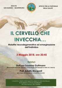 Giovedì 3 maggio 2018 alle ore 20,45 presso la Sala Montelupo di Domagnano si terrà l’incontro, proposto dall’Ufficio della Pastorale per la Salute della Diocesi di San Marino-Montefeltro, che avrà come tema: "IL CERVELLO INVECCHIA... MALATTIE NEURODEGENERATIVE ED EMARGINAZIONE DELL'INDIVIDUO".